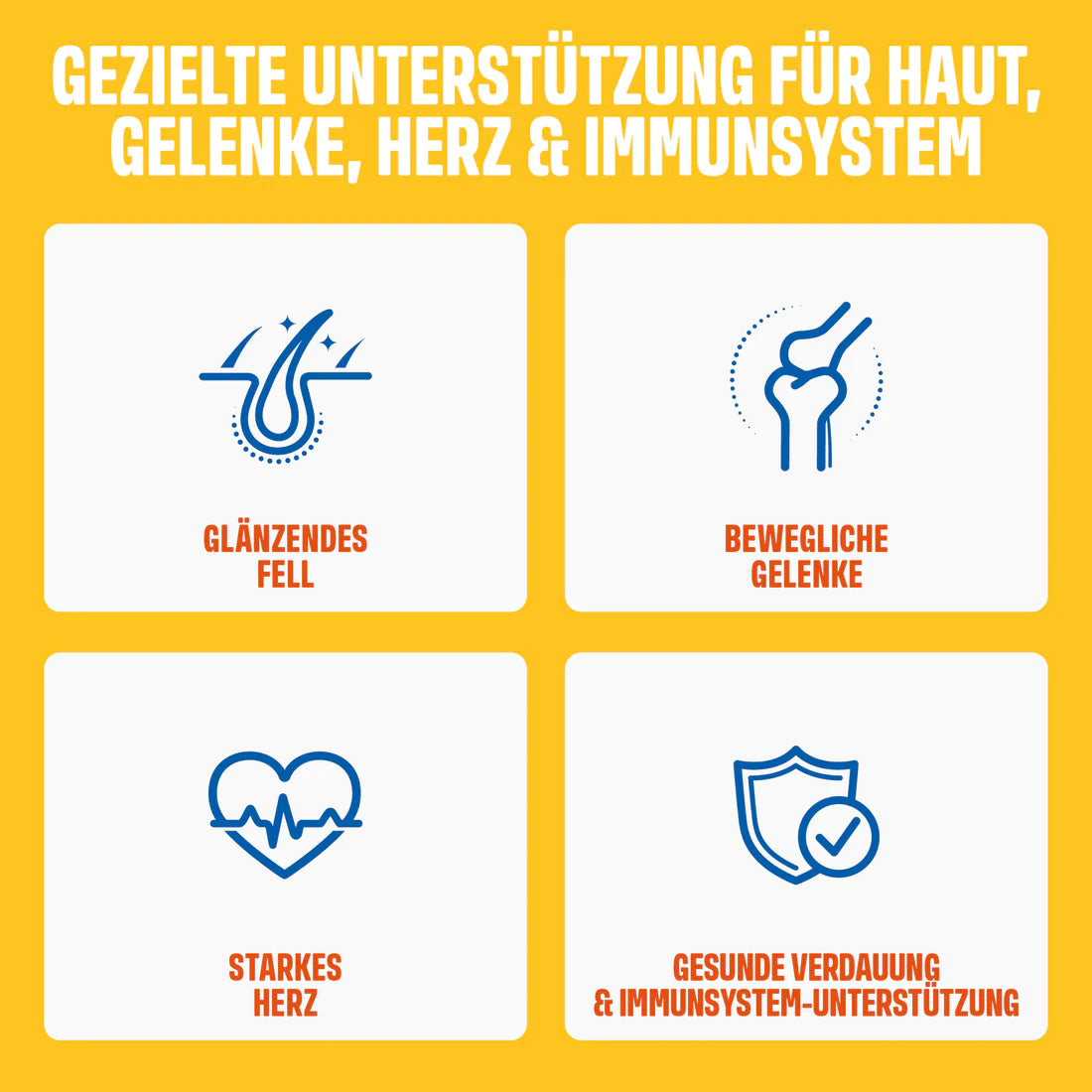 - All-round health for dogs and cats. Supports shiny coat, healthy joints, digestion, cardiovascular system and a strong immune system.
