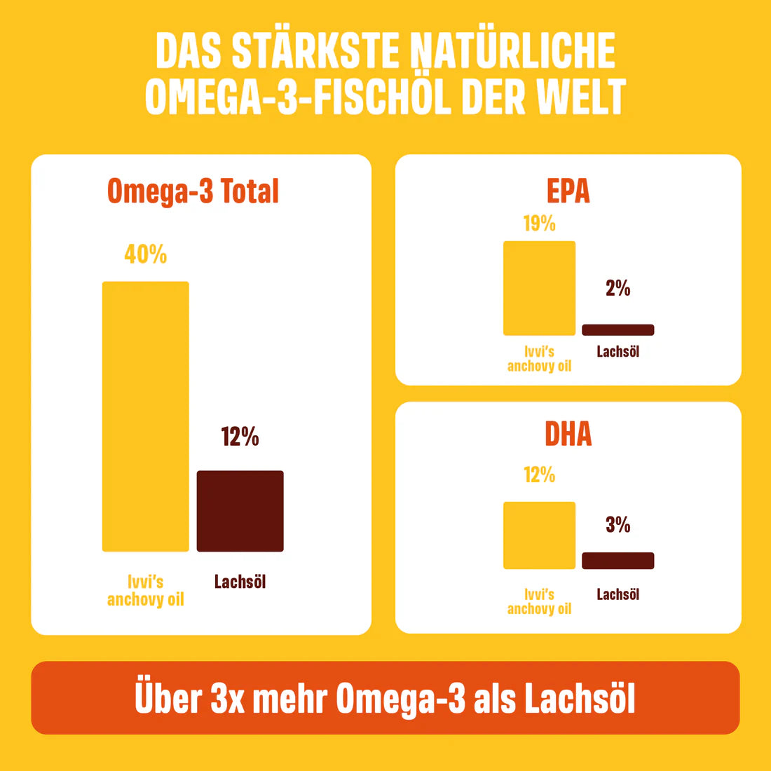- 3 x stronger than salmon oil. With over 39% total omega-3, our Anchovy oil delivers three times the effect of conventional salmon oil - for skin, joints, heart and immune system.